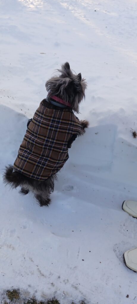 Lucy and Daisy are wearing clothing made by my friend Laura who with her partner helps create lovely doggy and kitty clothes. I just love them! Lucy likes them but Daisy isn’t as sure. (but she sure does look cute…) Shes giving me real attitude in the 3rd picture. An expression I’m deeply familiar with! lol. Laura sells some of these beautiful clothes on Facebook…Look up : ‘Beaus Beautique’!